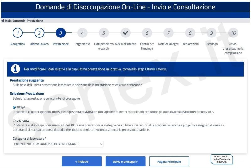 Pulsante “Salva e prosegui” e si apre la schermata 3 – “Prestazione” – dove occorre flaggare se la richiesta si riferisce alla NASpI o alla DIS-COLL e indicare la “Categoria di lavoratore”.